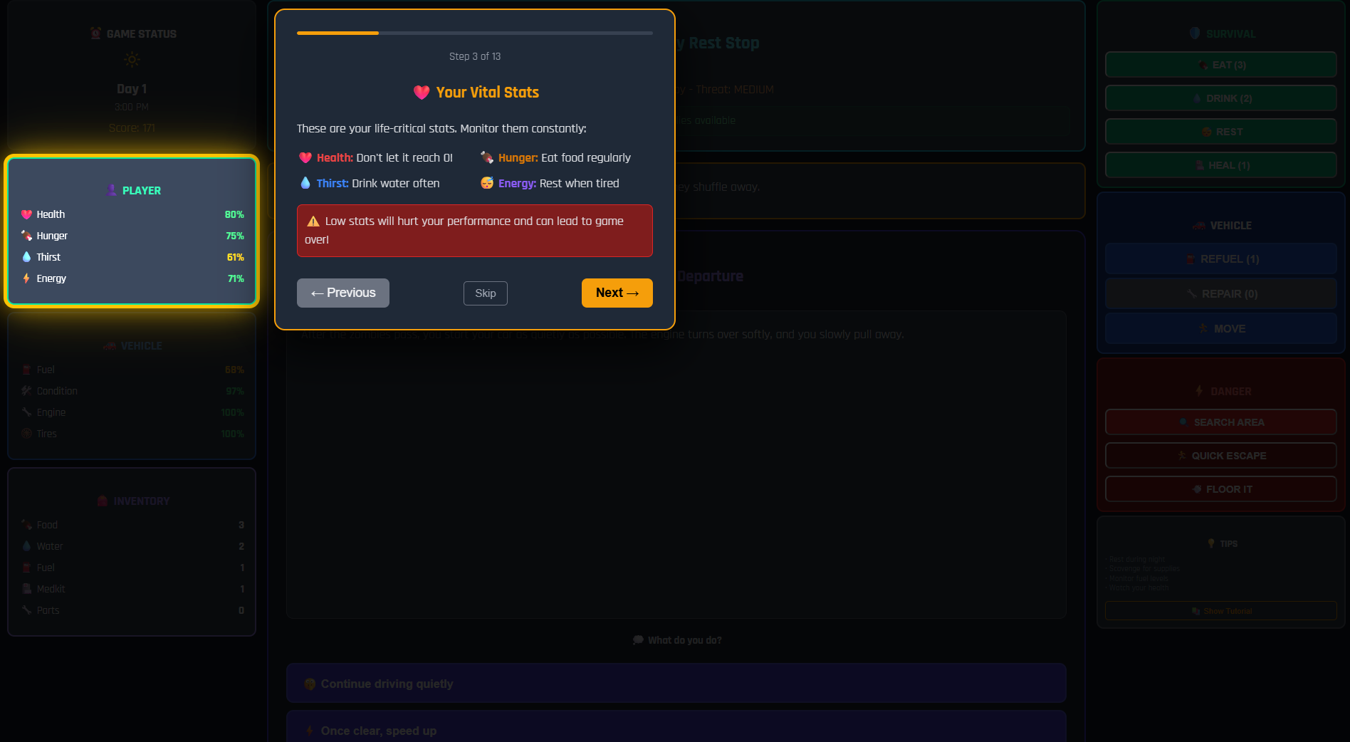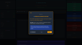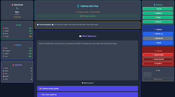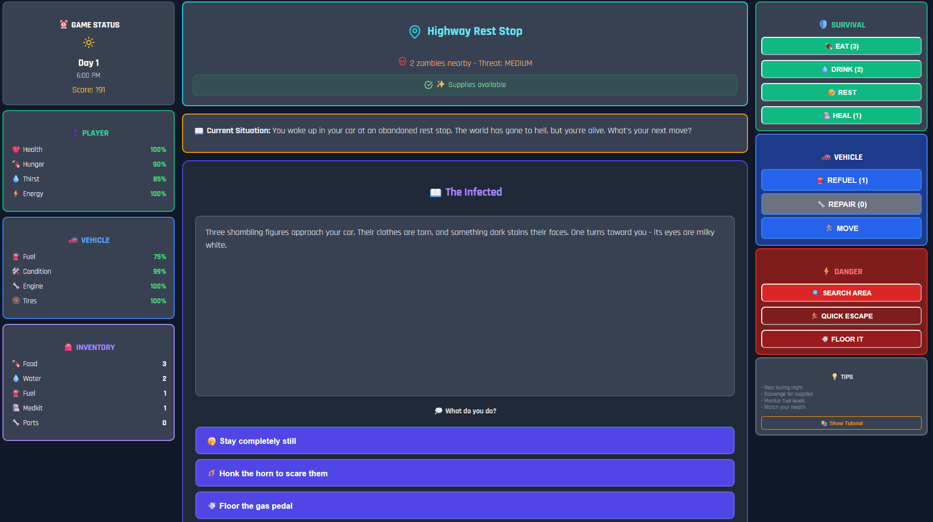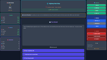 Gameplay: You start with limited supplies in your car as zombies roam the wasteland. Each action costs time and energy while affecting your survival stats. Scavenge for food, water, and fuel in dangerous areas, or seek safer locations to rest and recover. Every choice matters - will you risk venturing into zombie-infested areas for better supplies, or play it safe and conserve your resources?